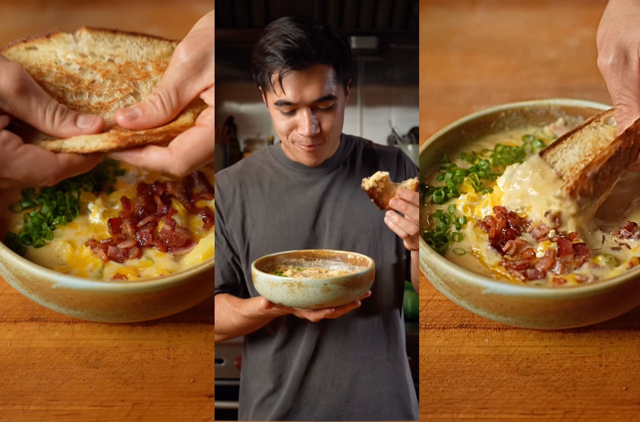 - Μοιράζουμε τη σούπα σε μπολ και γαρνίρουμε με το τραγανό μπέικον, φρέσκο κρεμμυδάκι, μια κουταλιά ξινή κρέμα ή γιαούρτι και έξτρα τυρί cheddar.