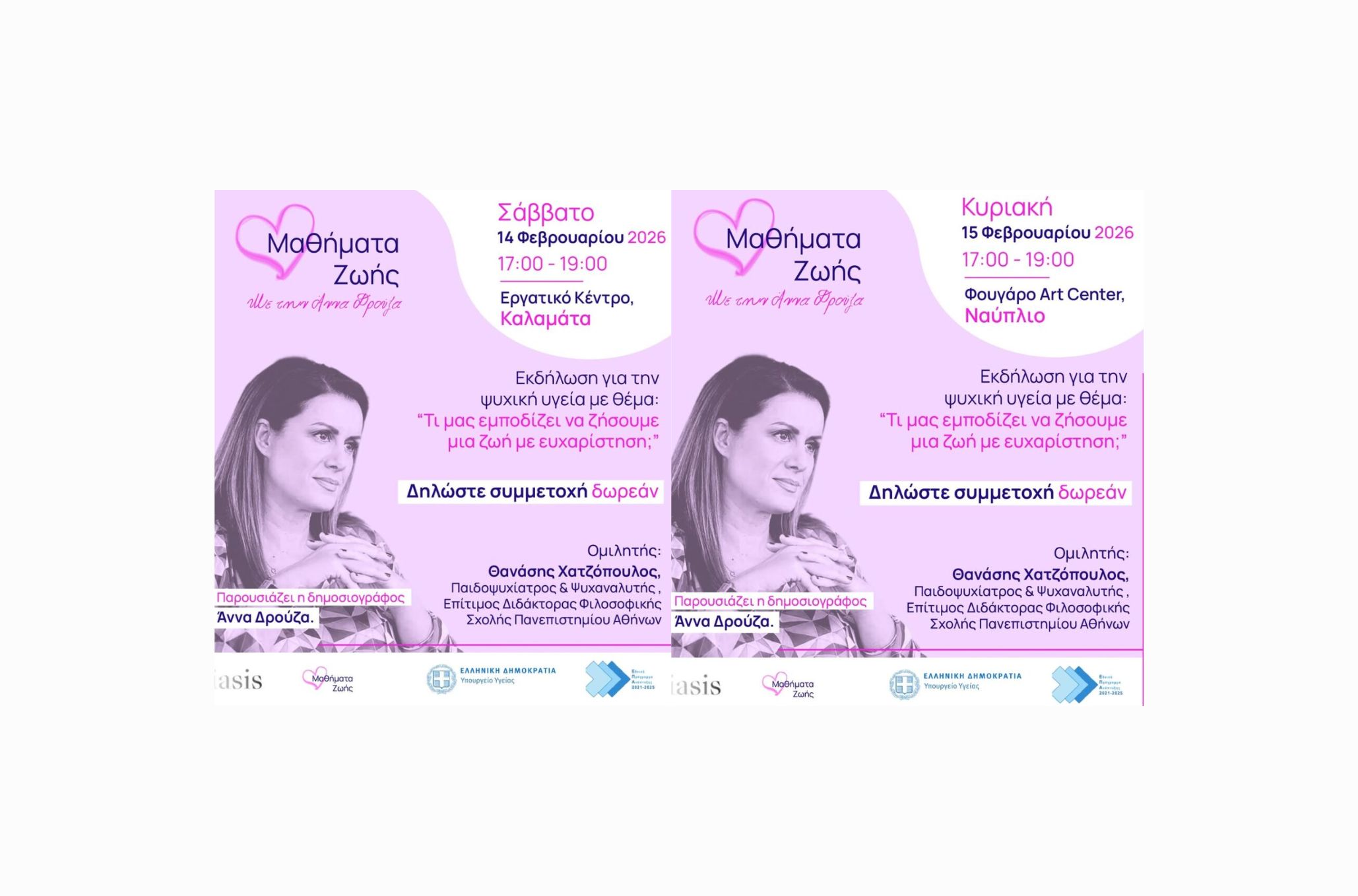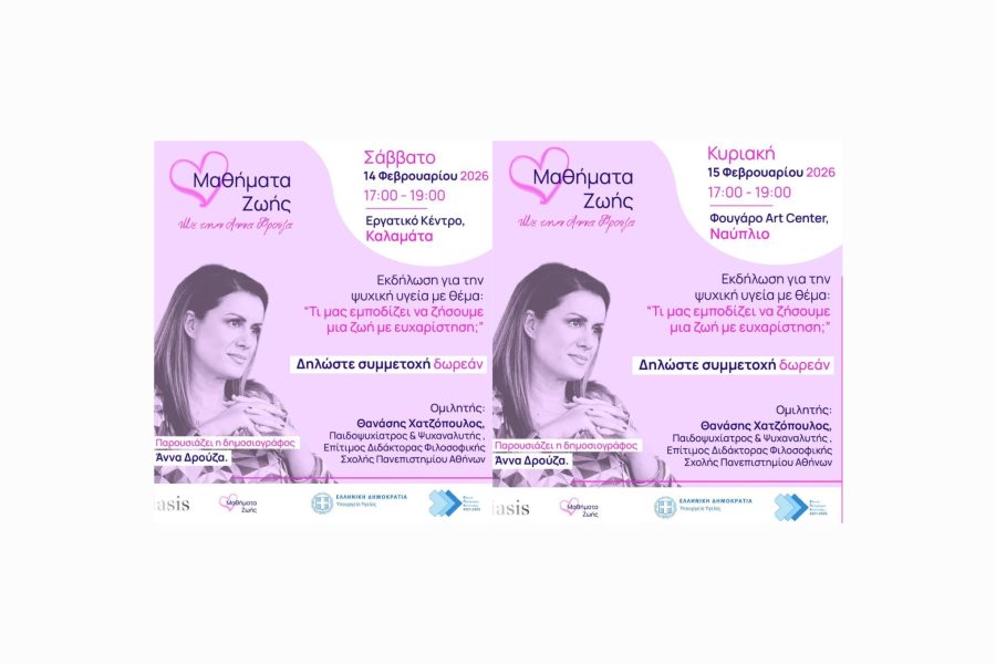 Η IASIS NGO και τα Μαθήματα Ζωής σας προσκαλούν στην εκδήλωση που θα πραγματοποιηθεί στην Καλαμάτα και στο Ναύπλιο, για την ψυχική υγεία με θέμα: “Τι μας εμποδίζει να ζήσουμε μια ζωή με ευχαρίστηση;”