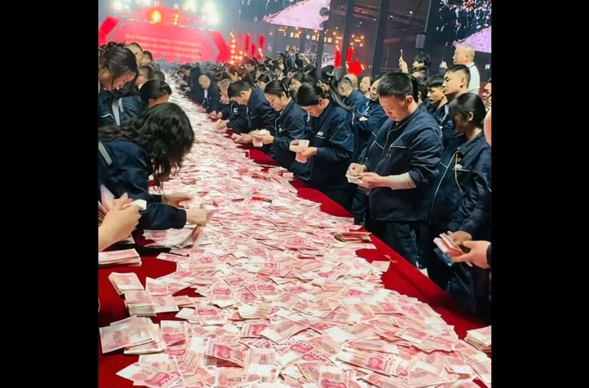 During a Chinese New Year celebration, Henan Kuangshan Crane piled up mountains of cash for 7,000 employees.